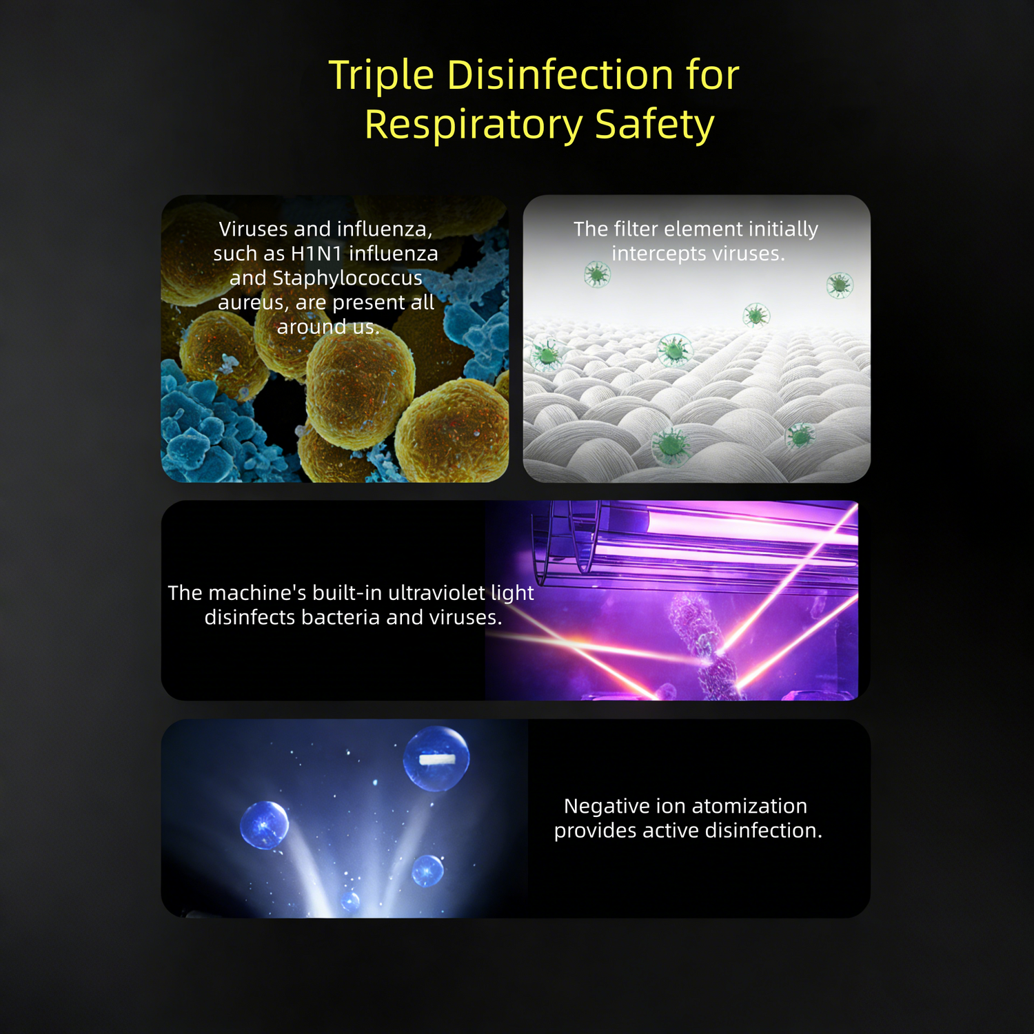 High CADR value for rapid air purification; UVC ultraviolet sterilization and negative ion purification effectively remove smoke and exhaust fumes, eliminating odors. Suitable for medium-sized living rooms, smoking areas, and other locations.