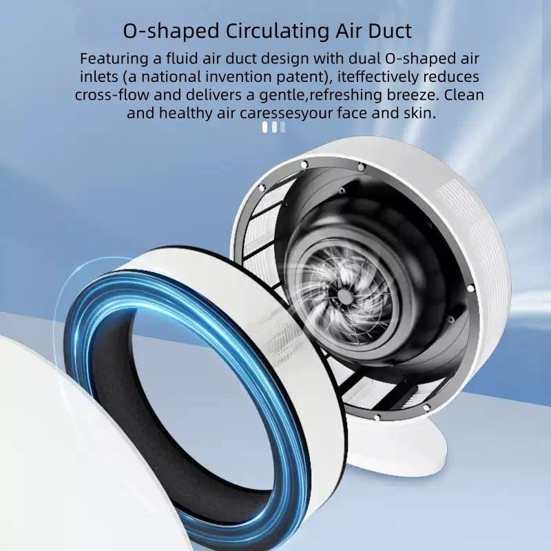 Featuring a fluid air duct design with dual O-shaped airinlets (a national invention patent),iteffectively reducescross-flow and delivers a gentle,refreshing breeze. Cleanand healthy air caressesyour face and skin.